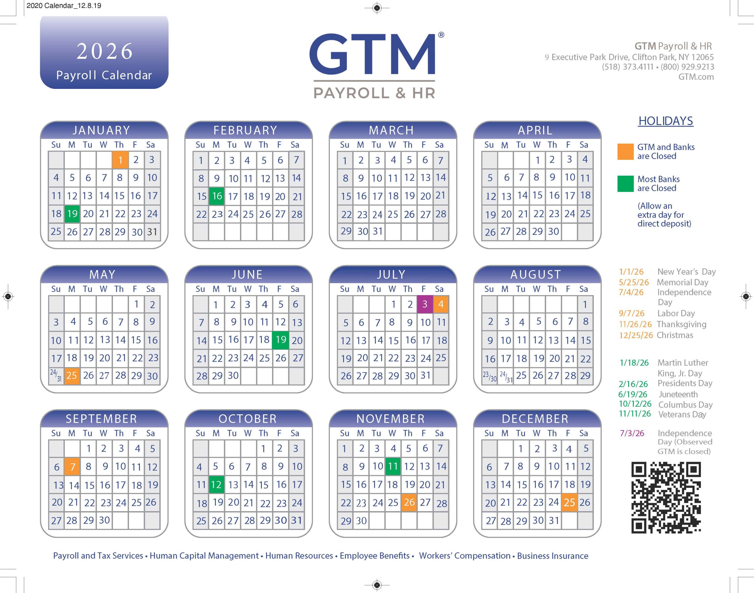 Payroll Holiday Calendar Make note of important bank holidays and GTM closings with our 2026 Payroll Holiday Calendar (click to enlarge). Free Download: Your Complete Business Solution Need Help? Call 518-373-4111 Email Us Refer a business and earn rewards Learn more Free Download: The Complete Guide to Small Business Payroll Stay up to date with our newsletter